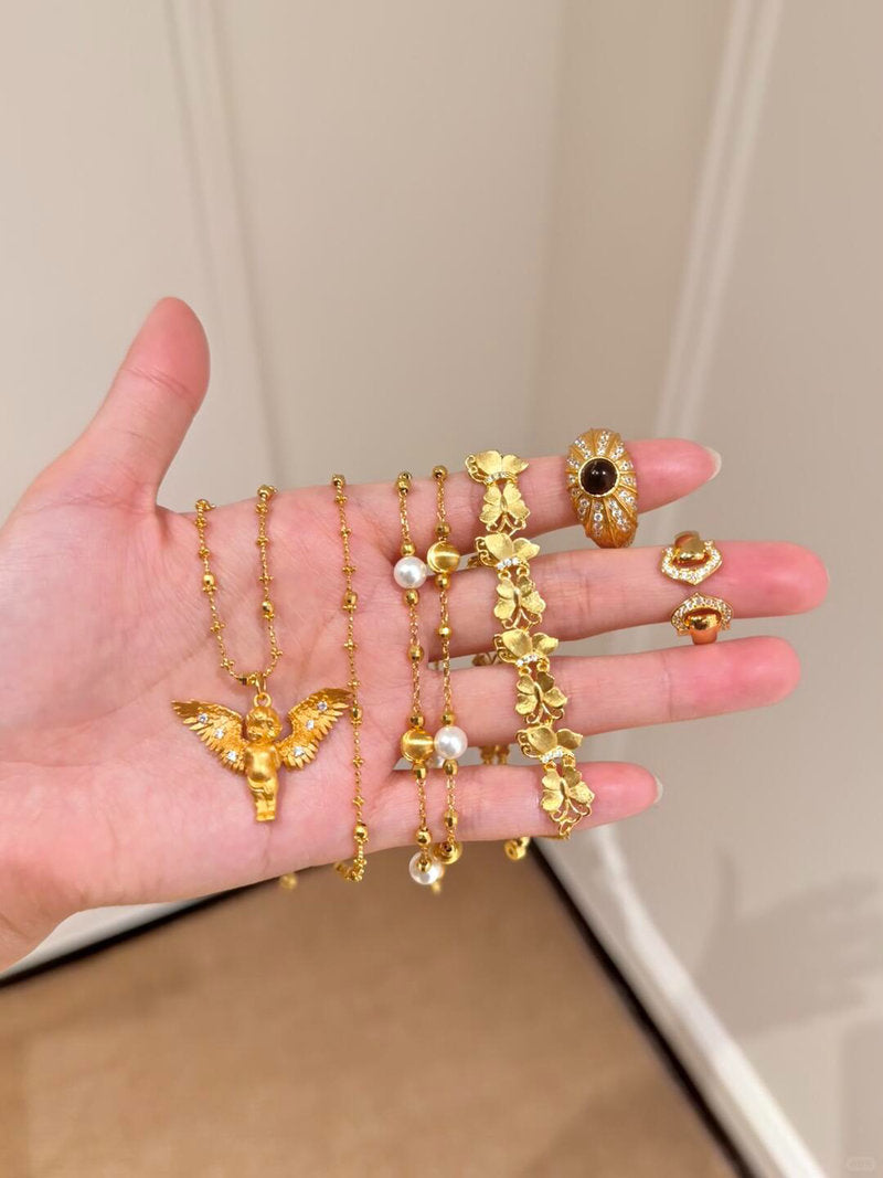 The Guardian Angel Necklace is a tribute to faith and grace. The angel with outstretched wings embodies protection and hope, while the pearls and golden beads along the chain symbolize purity and light. Handcrafted in 925 sterling silver and plated with 18K gold, each detail shines with warm luminosity — a modern talisman that echoes divine beauty and inner strength.